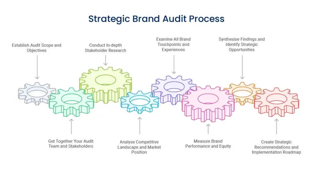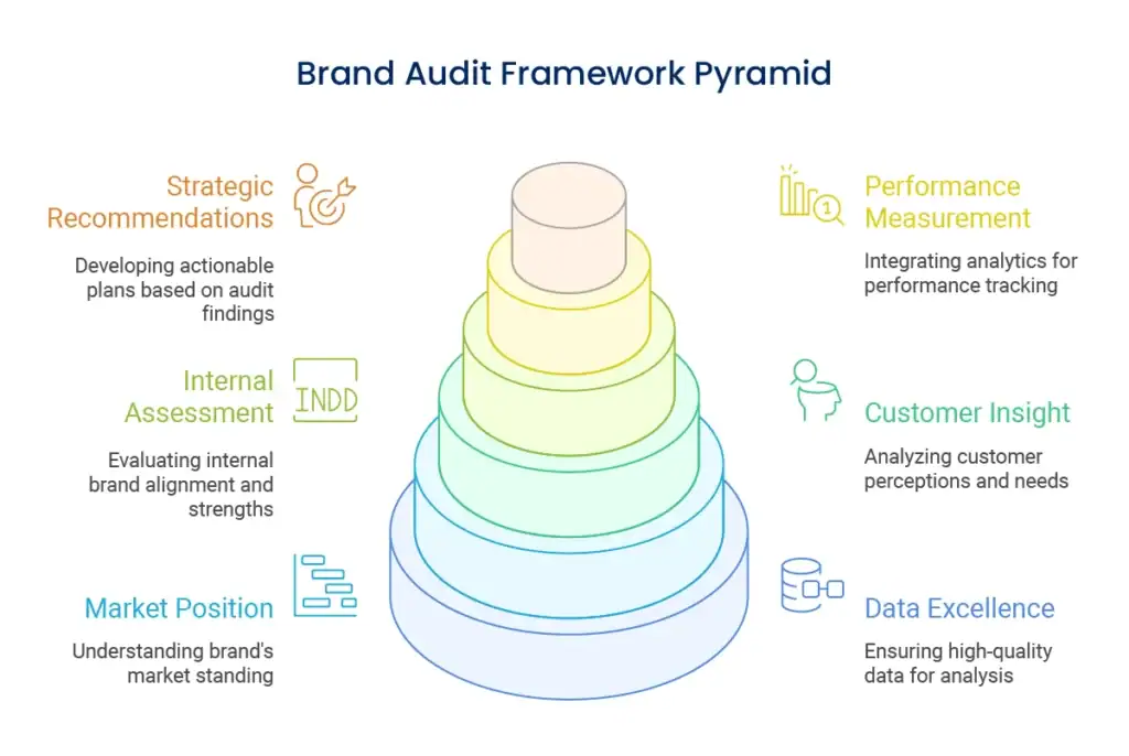 The procedure of doing this is gathering and analysing quantitative data (web analytics, social media metrics, sales figures) together with qualitative insights (employee feedback, market research, customer interviews). The combination provides an overall picture of your brand’s ecosystem—from internal brand alignment in your organisation through to external market positioning against competitors.